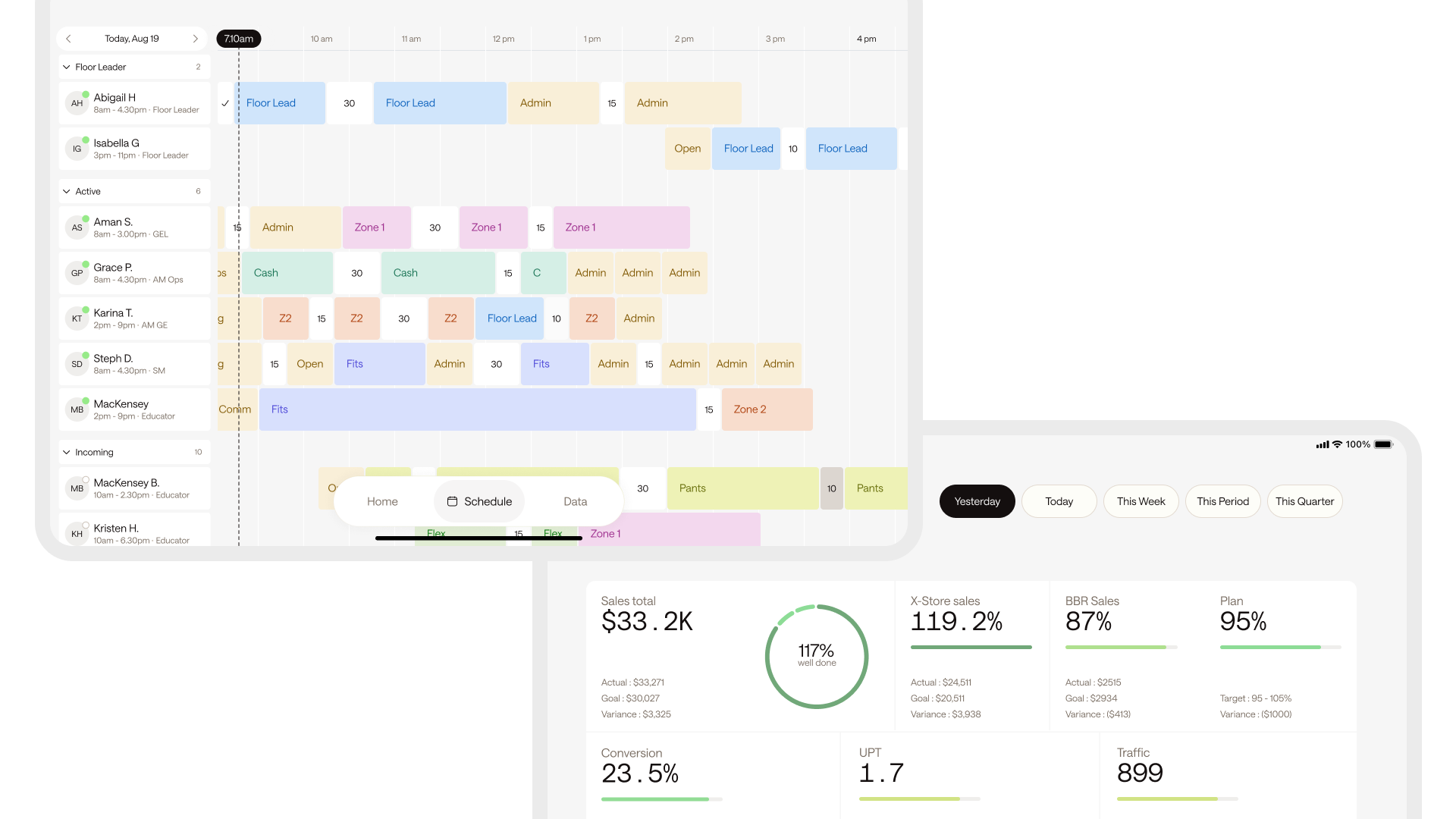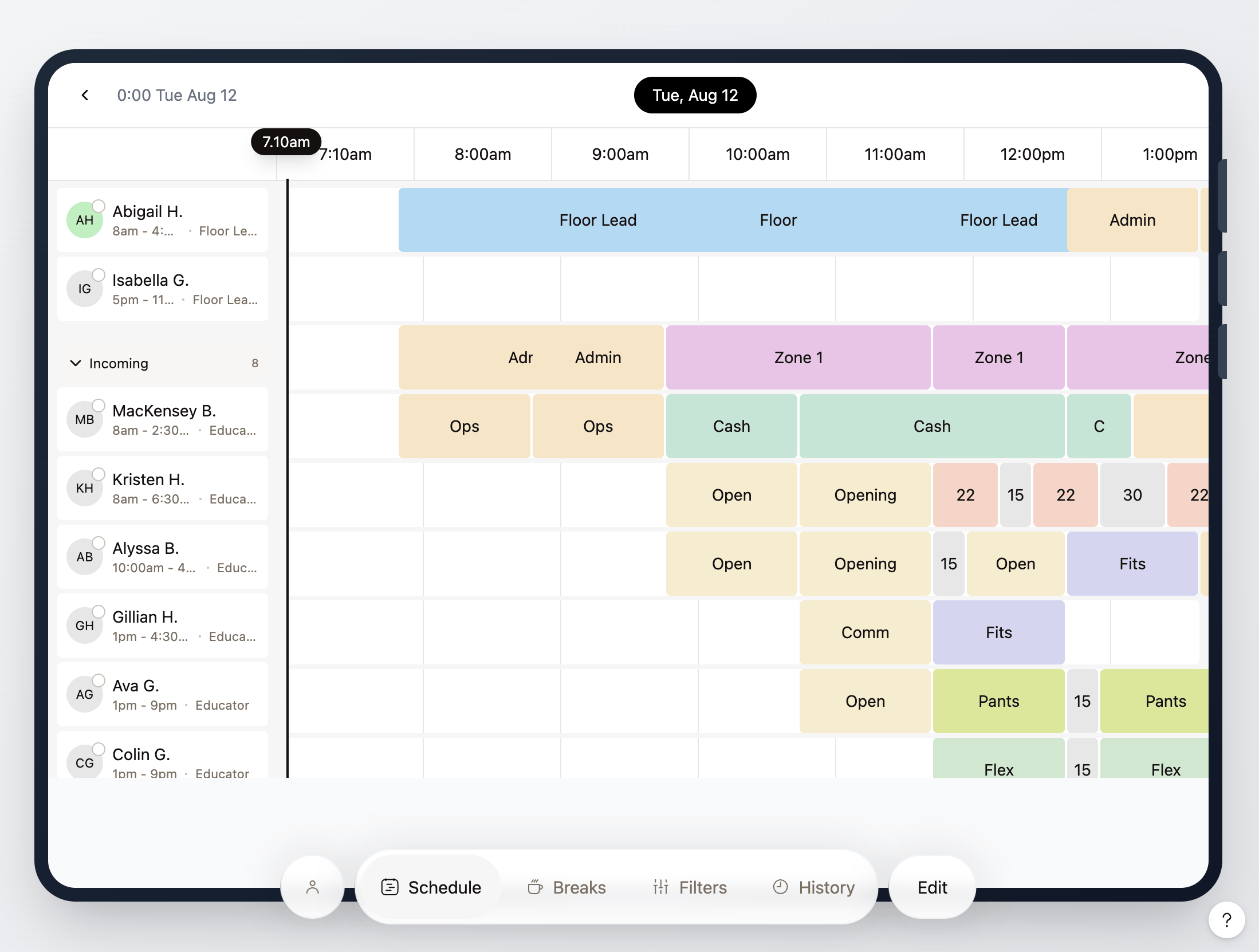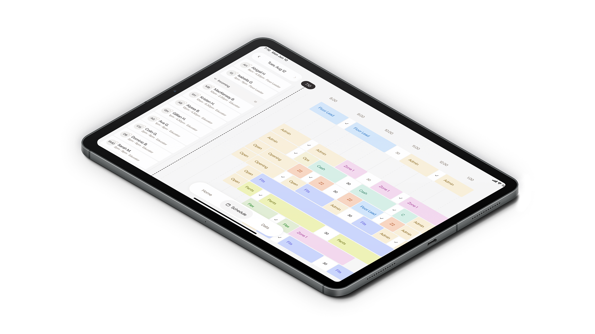 Floor Leaders have the ability to login, view 7 days of store scheduling, customize schedules, update educators on dedicated zones and break time plus get all necessary store data all.